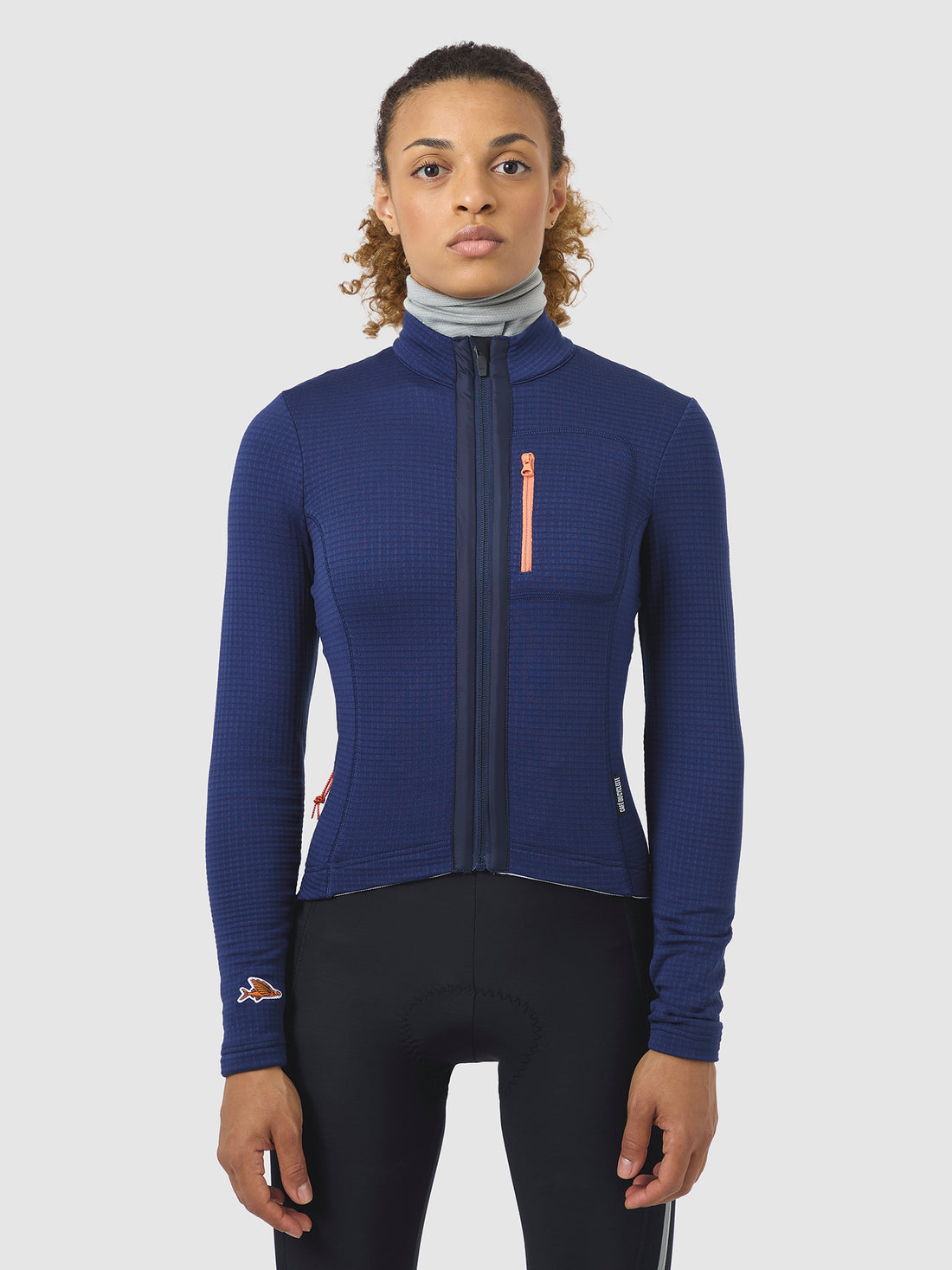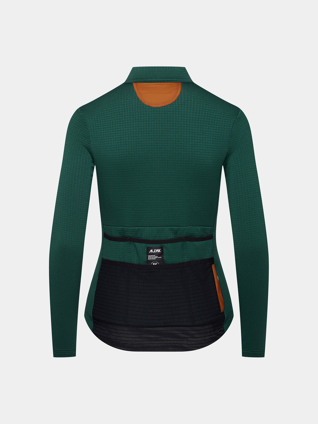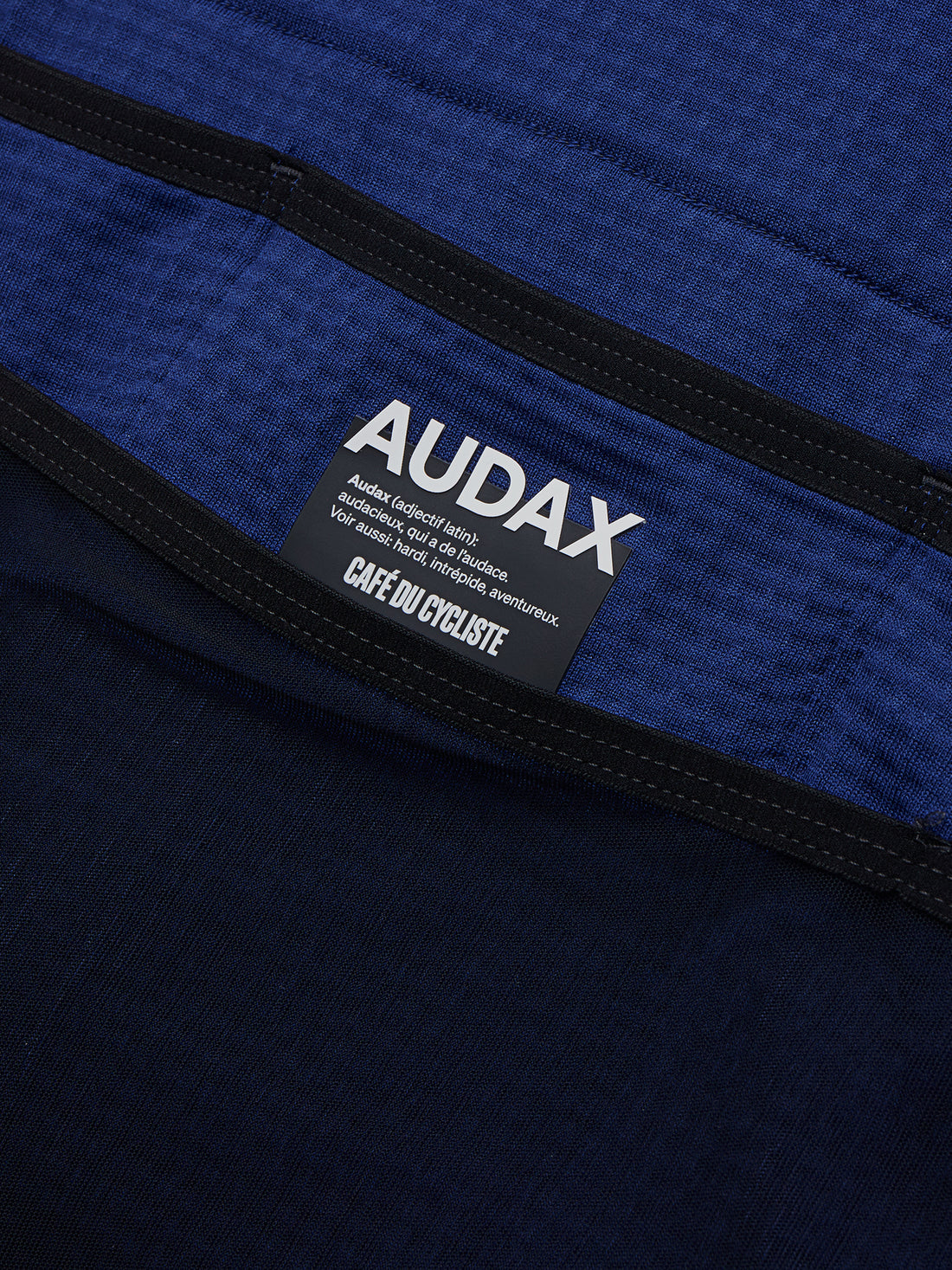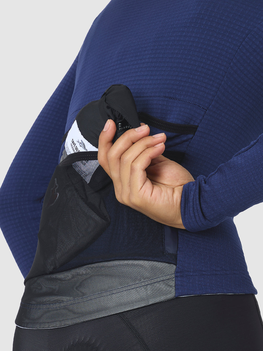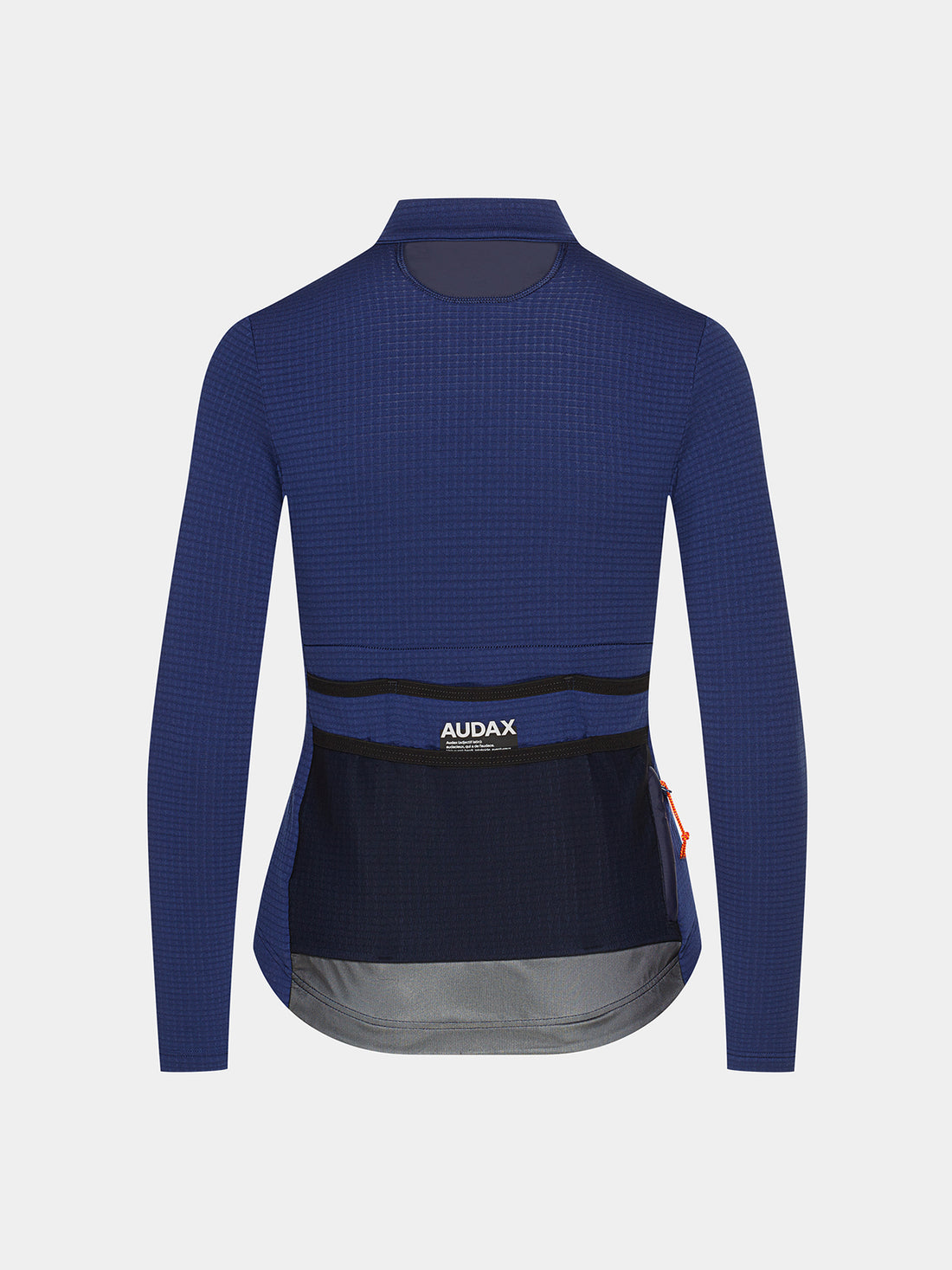 A midweight Audax jersey for going the distance in cooler temperatures. With an Italian-milled fabric spun from recycled polyester, its waffle-textured ‘air channel’ structure is adaptable enough for long-distance efforts when shifts in temperature can make or break a ride. Wind-blocking elements help to retain warmth, and our signature oversized mesh drop pocket is ideal for extra layers, tools or nutrition. And a neat chest zip pocket fits valuable items within easy reach on the go.
