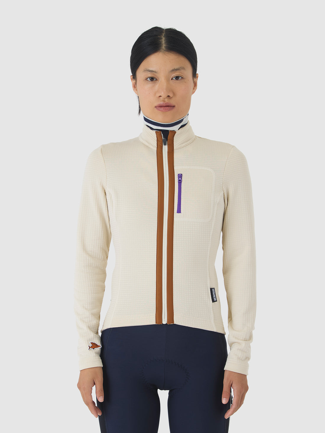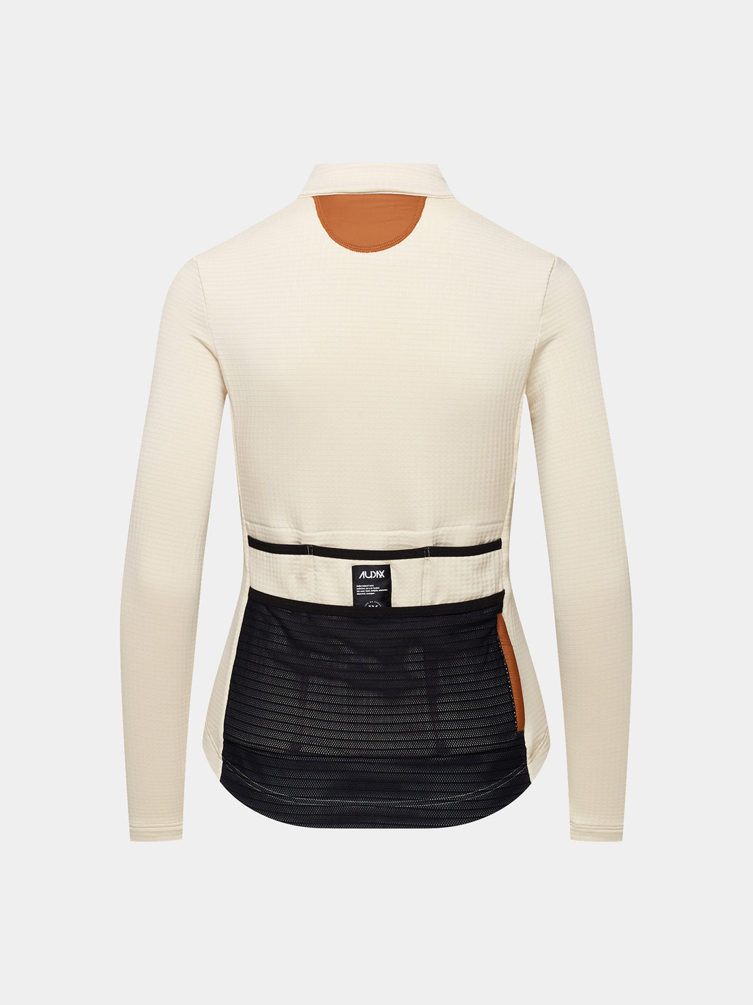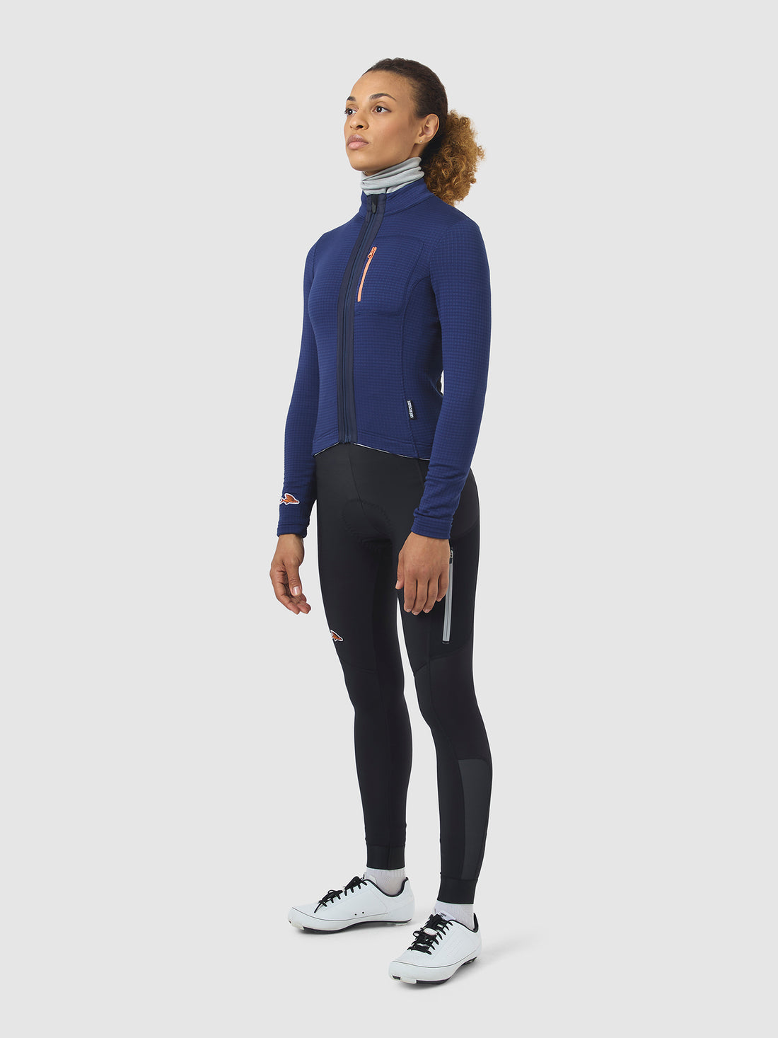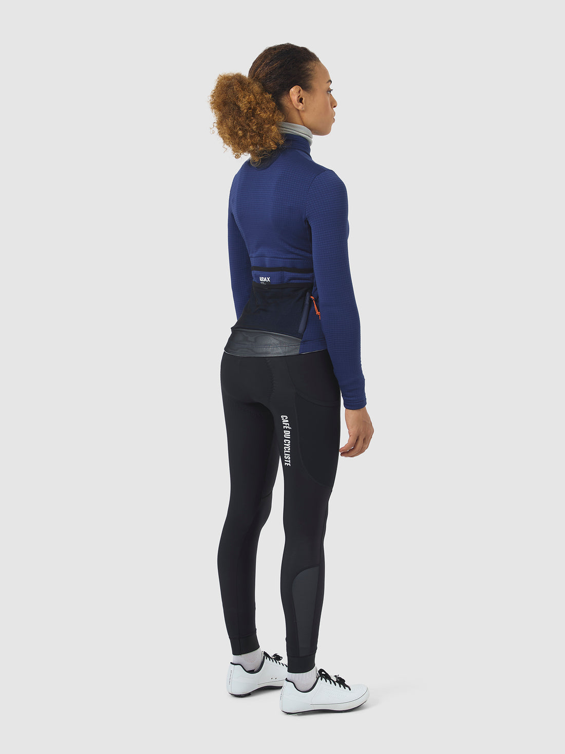 A midweight Audax jersey for going the distance in cooler temperatures. With an Italian-milled fabric spun from recycled polyester, its waffle-textured ‘air channel’ structure is adaptable enough for long-distance efforts when shifts in temperature can make or break a ride. Wind-blocking elements help to retain warmth, and our signature oversized mesh drop pocket is ideal for extra layers, tools or nutrition. And a neat chest zip pocket fits valuable items within easy reach on the go.