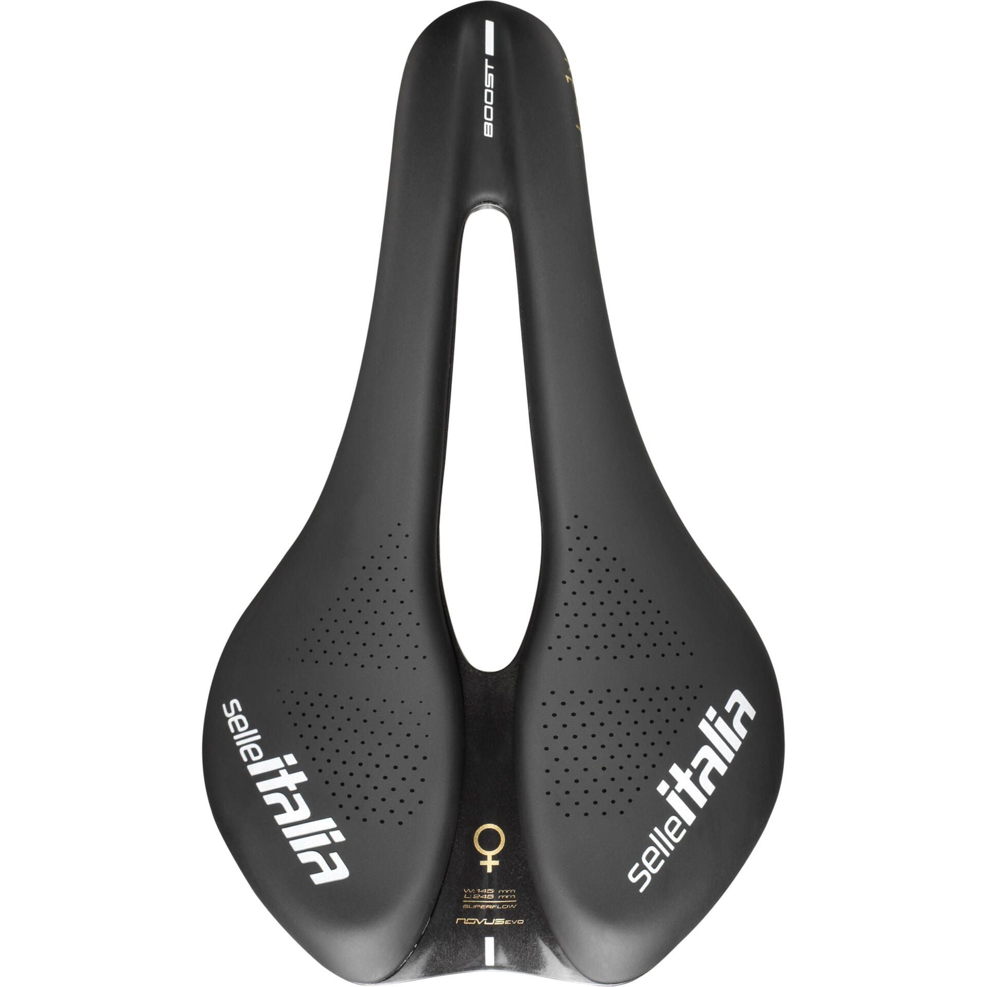 Created with pure comfort in mind for female riders, the Novus Boost Evo Lady TM Superflow is ideal for epic rides through the most challenging of landscapes. Completely redesigned from the ground up, this saddle is lightweight and comfortable thanks to its wave profile. This evolved design supports your ischial bones on long rides and Superflow cut-out reduces pressure on the perineum. The short nose improves pedalling ergonomics, manoeuvrability, comfort and performance.